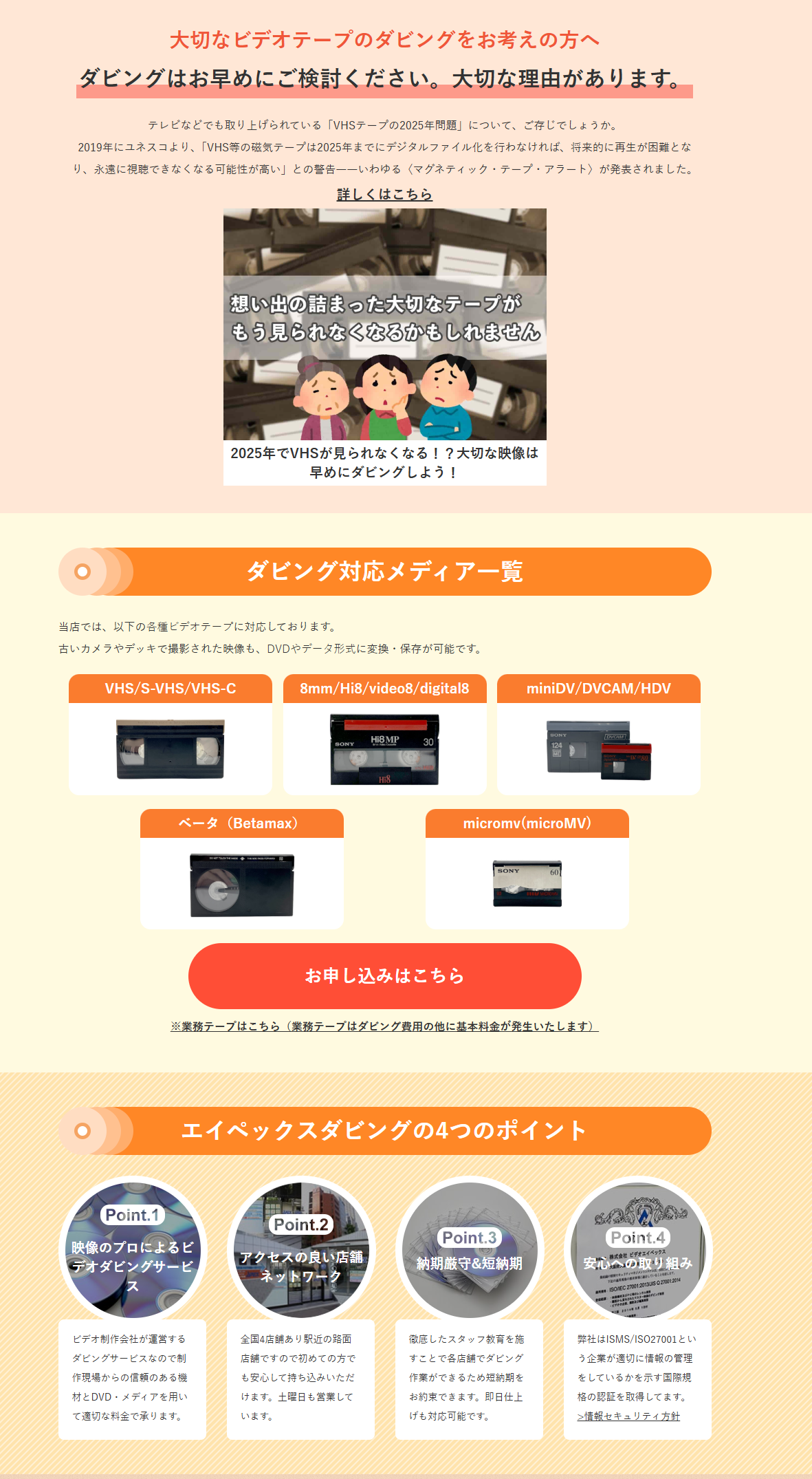 / 家電 エイペックスダビング 詳細はこちら ・激安ではないですが、安心してクオリティの高い成果物を納品させていただくを最重要事項としています。 ・ビデオ制作会社が運営するダビングサービスなので制作現場からの信頼のある機材と DVD・メディアを用いて適切な料金で承ります。・全国4店舗あり駅近の路面店舗ですので初めての方でも安心して持ち込みいただけます。 土曜日も営業しています。