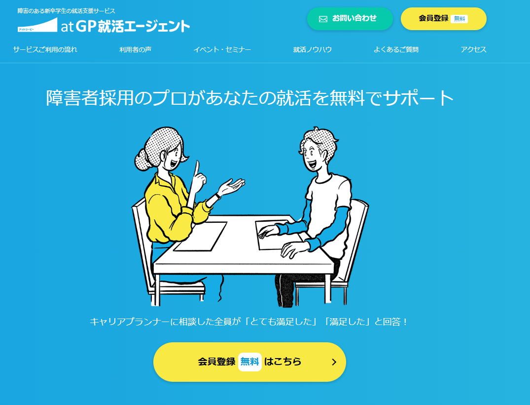 / 就職・転職 atGP 就活エージェント 詳細はこちら 障害のある新卒学生専門!就活の悩みをプロがマンツーマンで解決する無料エージェント! 600社以上の企業ネットワークから、障害者雇用に積極的な企業の非公開求人を紹介! ES・面接対策から内定後フォローまで完全対応。就活が初めてでも一人で悩まず進められる安心サポート!